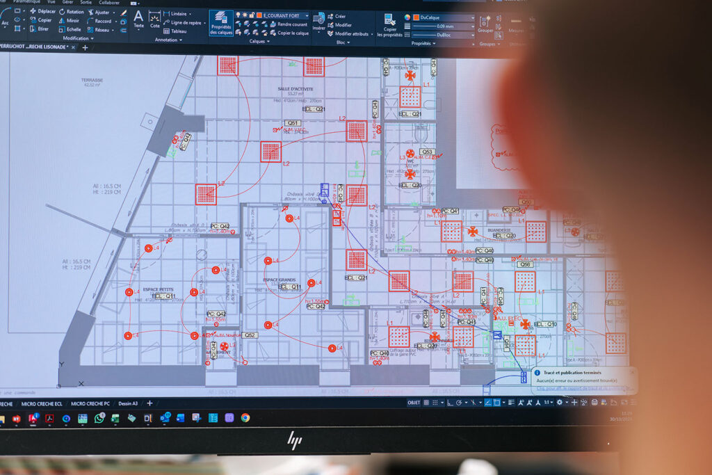 Perruchot Électricité, forte de ses 25 ans d’expérience, apporte ses compétences en courants faibles et forts. Grâce à notre bureau d’étude intégré équipé des logiciels AutoCAD et Caneco, ainsi qu’à la fabrication des armoires électriques en interne, nous gérons des chantiers en intégralité. Cela nous confère une autonomie parfaite sur nos dossiers clients.